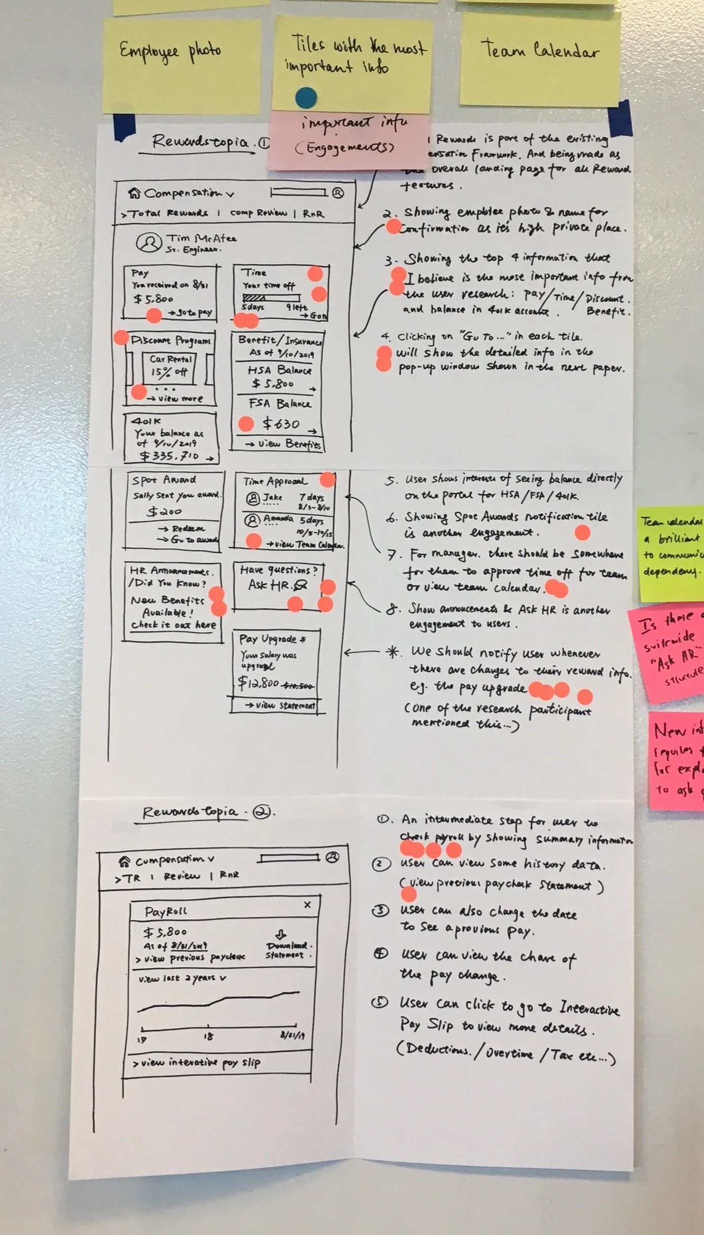 Most workshop participants liked my ideas of using engagement tiles for each comp data, prioritizing Pay, Time, Benefits on top of the page, as well as showing important updates/notifications to user if any changes to their rewards info.